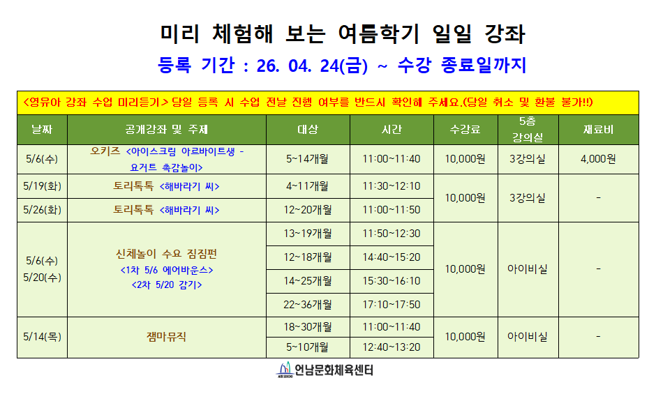 | 15:00~15:40 | 무료강습(30분) | 코어 스트레칭 | 무료강습(30분) | 코어 스트레칭 | 무료강습(30분) |