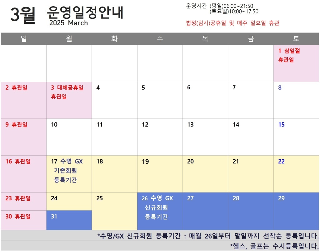 공지사항 3월 운영일정안내 운영일정 작성자 언남문화체육센터 작성일 2025-02-25 06:01 조회 450 인쇄 « (3월 개강) 줌바댄스 4월 운영일정안내 » 목록보기 Powered by KBoard