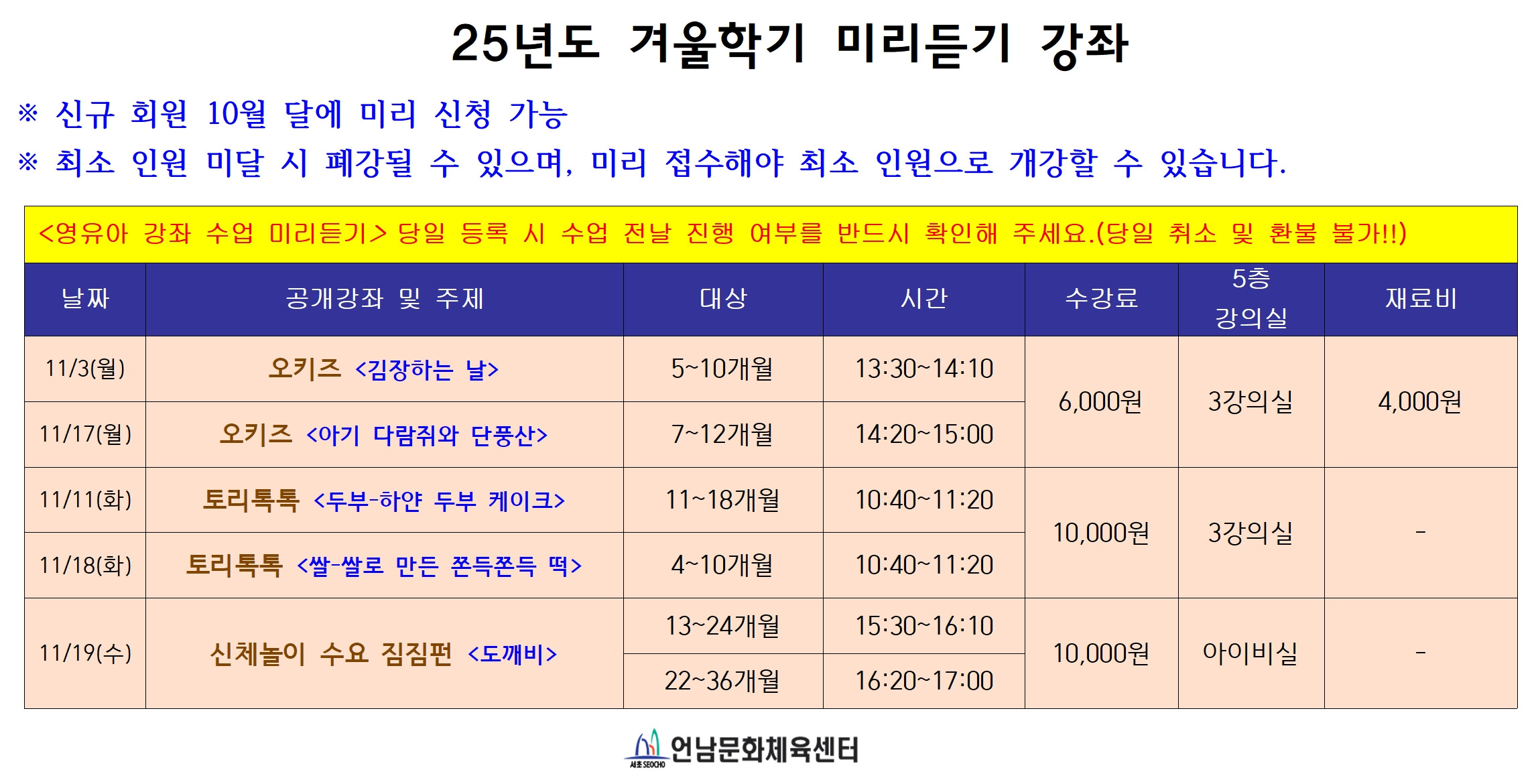신규 및 추천강좌 25년도 겨울학기 미리듣기 강좌 작성자 언남문화체육센터 작성일 2025-10-29 13:34 조회 129 인쇄 « 겨울학기 회원모집 (초등) 한국사/독서 논술/ 주산암산 » 목록보기 Powered by KBoard